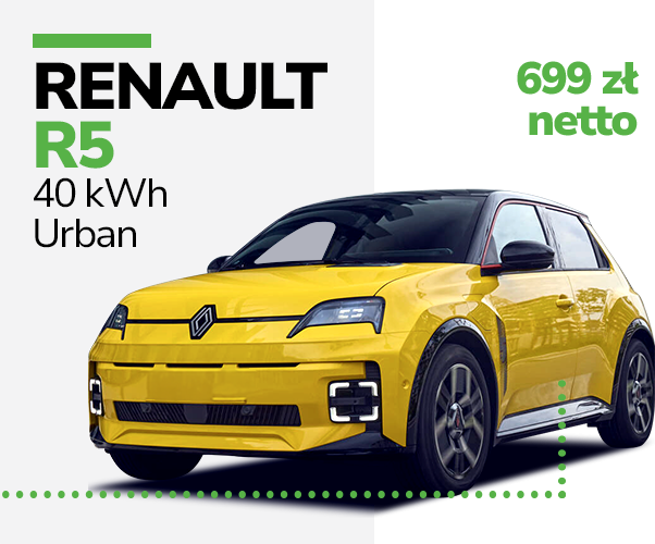 Renault R5 40 kWh Urban to kompaktowy samochód elektryczny, idealny dla jednoosobowych działalności gospodarczych (JDG) wynajmujących pojazdy. Zasięg do 300 km i ładowanie baterii od 15% do 80% ok. 30 minut. Z dopłatą NaszEauto w elektryzującej cenie!